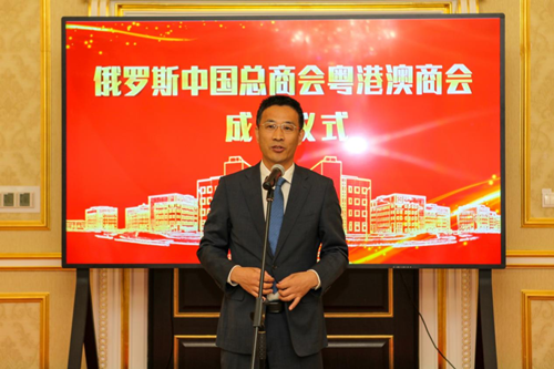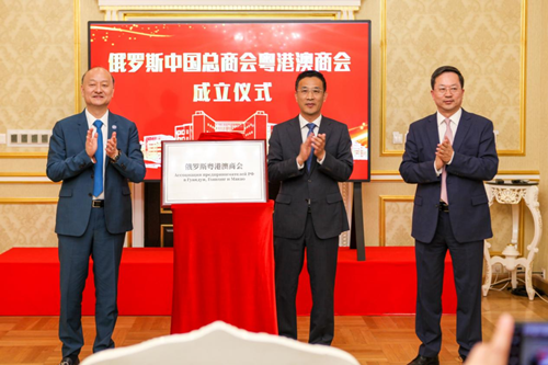 于宏驰参赞、周立群会长与胡智荣主席共同为俄罗斯中国总商会粤港澳商会成立揭牌