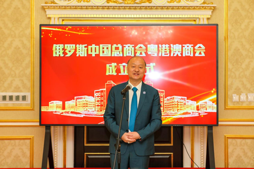 周立群致辞时代表总商会和格林伍德国际贸易中心对出席活动的嘉宾和朋友表示欢迎。他表示,十多年来,俄罗斯中国总商会,为维护企业的合法权益,增进企业之间的交流,促进中俄经贸合作发挥了积极作用,在中俄工商界享有盛誉。他指出,粤港澳商会的成立,将有助于大湾区企业在俄相互交流、抱团取暖、团结协作,也将为俄罗斯中国总商会联系大湾区企业,积极投身中俄经贸合作发挥重要作用,希望粤港澳商会带领广大会员企业,加强自身建设、加强合规经营、加强相互合作,为中俄经贸合作高质量发展贡献力量。